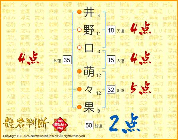 井(4画)野(11画)口(3画) 萌(12画)々(12画)果(8画)