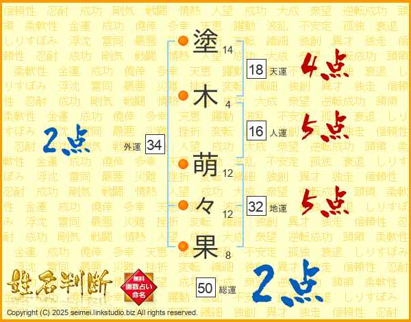 塗(14画)木(4画) 萌(12画)々(12画)果(8画)