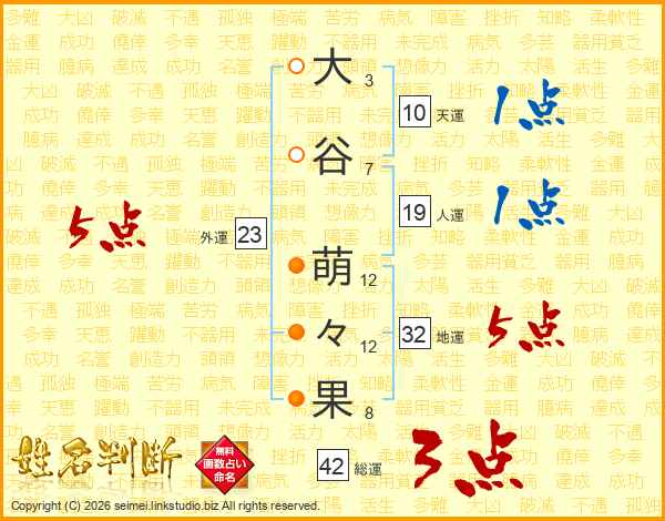 大(3画)谷(7画) 萌(12画)々(12画)果(8画)
