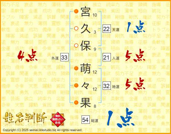 宮(10画)久(3画)保(9画) 萌(12画)々(12画)果(8画)