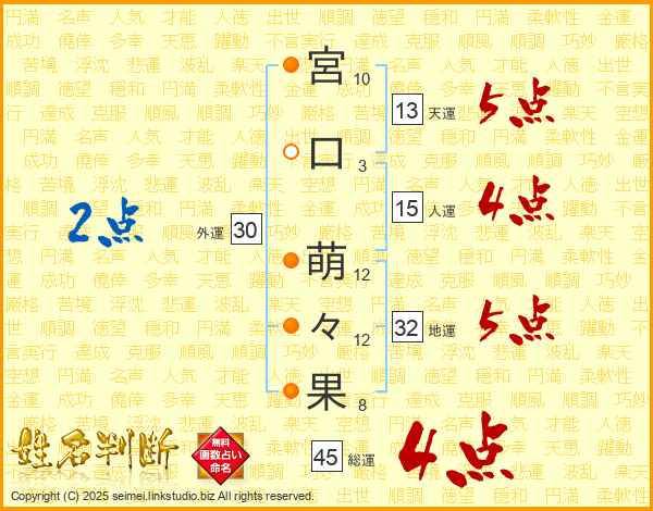 宮(10画)口(3画) 萌(12画)々(12画)果(8画)