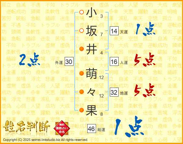 小(3画)坂(7画)井(4画) 萌(12画)々(12画)果(8画)