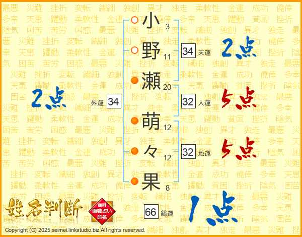 小(3画)野(11画)瀬(20画) 萌(12画)々(12画)果(8画)