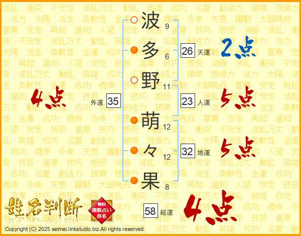 波(9画)多(6画)野(11画) 萌(12画)々(12画)果(8画)