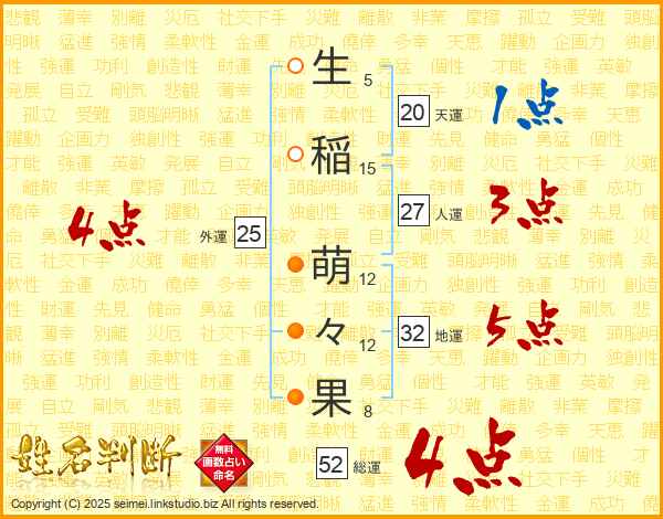 生(5画)稲(15画) 萌(12画)々(12画)果(8画)