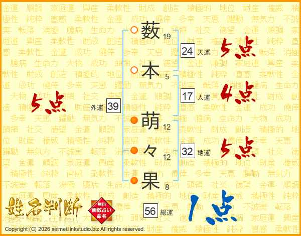 薮(19画)本(5画) 萌(12画)々(12画)果(8画)