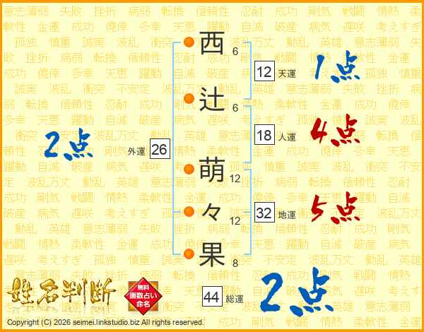 西(6画)辻(6画) 萌(12画)々(12画)果(8画)