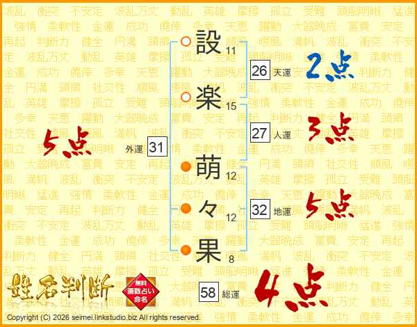 設(11画)楽(15画) 萌(12画)々(12画)果(8画)