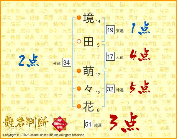 境(14画)田(5画) 萌(12画)々(12画)花(8画)