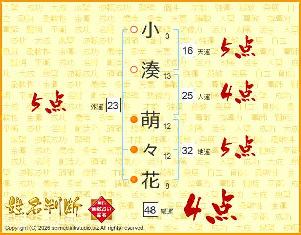 小(3画)湊(13画) 萌(12画)々(12画)花(8画)