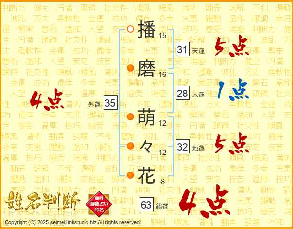 播(15画)磨(16画) 萌(12画)々(12画)花(8画)