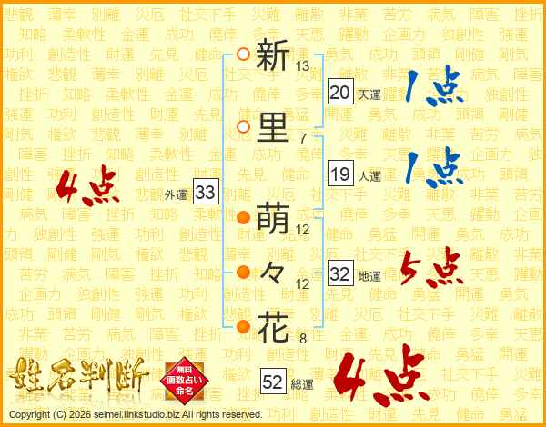 新(13画)里(7画) 萌(12画)々(12画)花(8画)