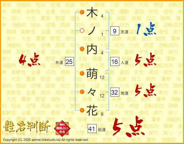 木(4画)ノ(1画)内(4画) 萌(12画)々(12画)花(8画)