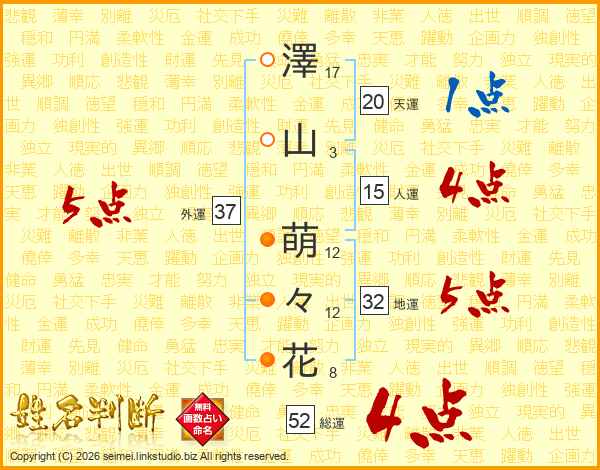 澤(17画)山(3画) 萌(12画)々(12画)花(8画)