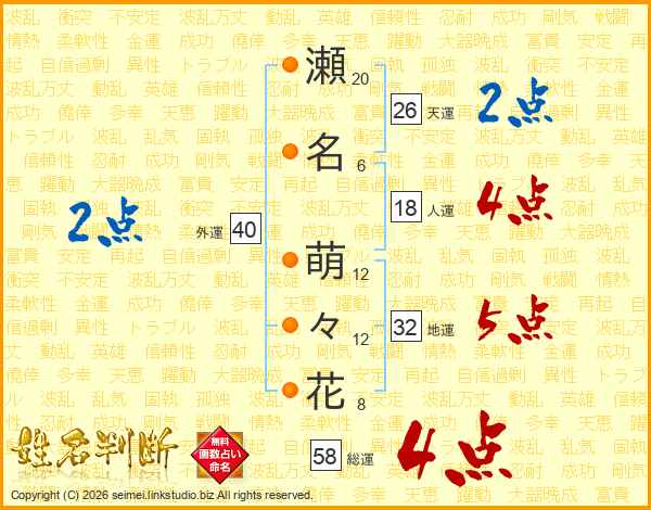 瀬名萌々花さんの総運は58画の4点!