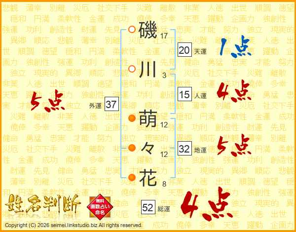 磯(17画)川(3画) 萌(12画)々(12画)花(8画)