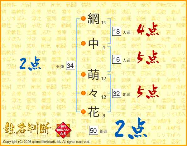 網(14画)中(4画) 萌(12画)々(12画)花(8画)