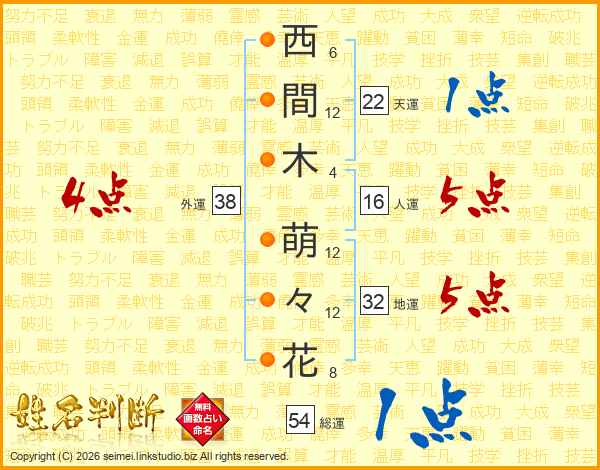 西(6画)間(12画)木(4画) 萌(12画)々(12画)花(8画)