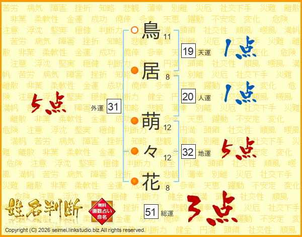 鳥(11画)居(8画) 萌(12画)々(12画)花(8画)