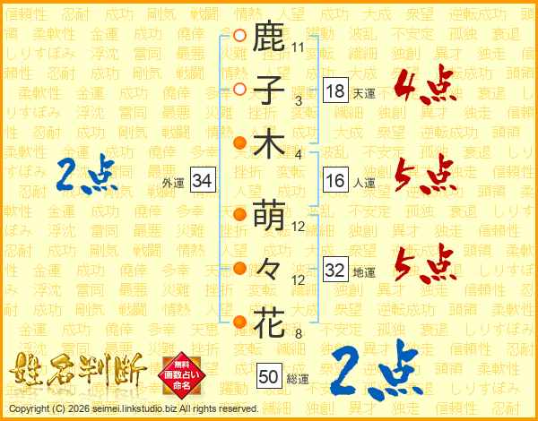 鹿(11画)子(3画)木(4画) 萌(12画)々(12画)花(8画)