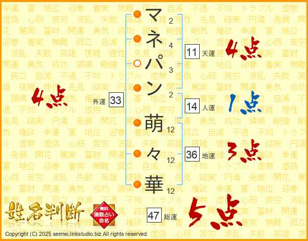 マ(2画)ネ(4画)パ(3画)ン(2画) 萌(12画)々(12画)華(12画)