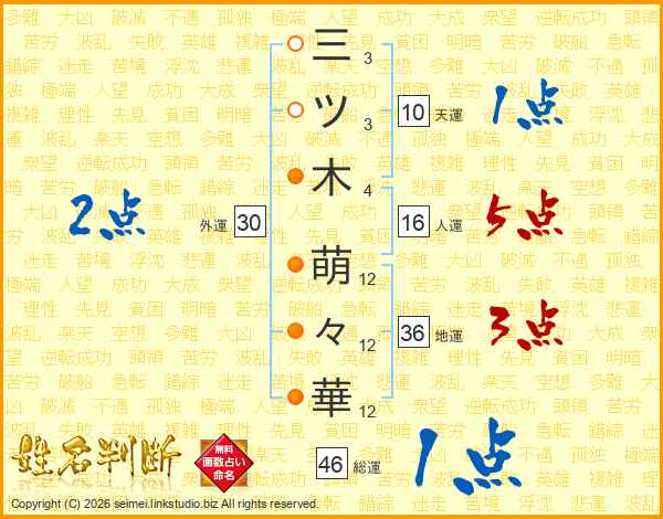三(3画)ツ(3画)木(4画) 萌(12画)々(12画)華(12画)