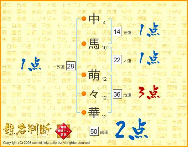 中(4画)馬(10画) 萌(12画)々(12画)華(12画)