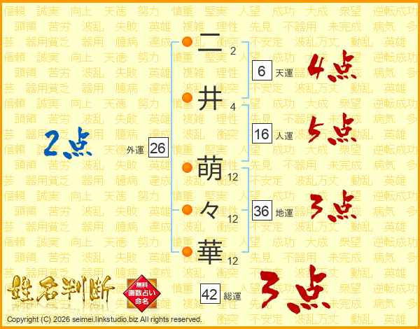 二(2画)井(4画) 萌(12画)々(12画)華(12画)