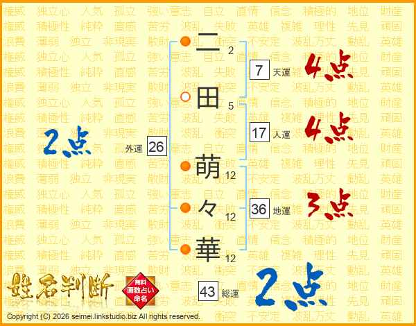 二(2画)田(5画) 萌(12画)々(12画)華(12画)