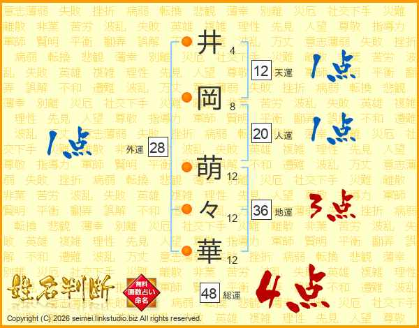 井(4画)岡(8画) 萌(12画)々(12画)華(12画)