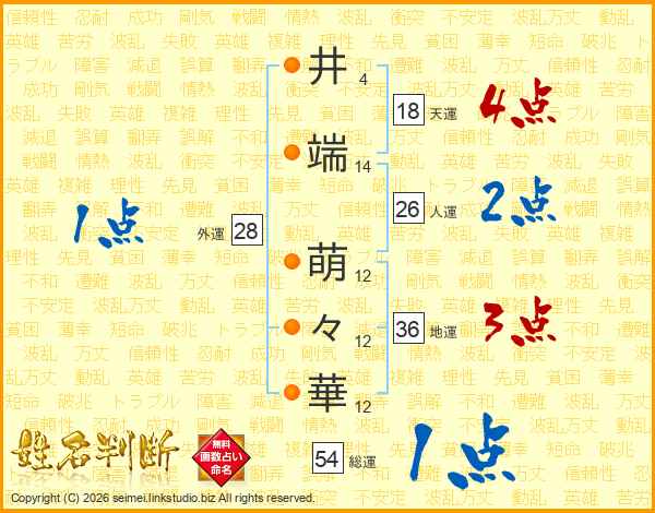 井(4画)端(14画) 萌(12画)々(12画)華(12画)