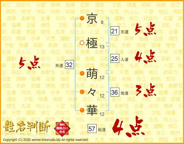 京(8画)極(13画) 萌(12画)々(12画)華(12画)
