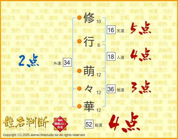 修(10画)行(6画) 萌(12画)々(12画)華(12画)