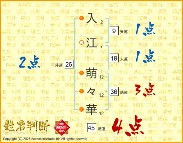 入(2画)江(7画) 萌(12画)々(12画)華(12画)