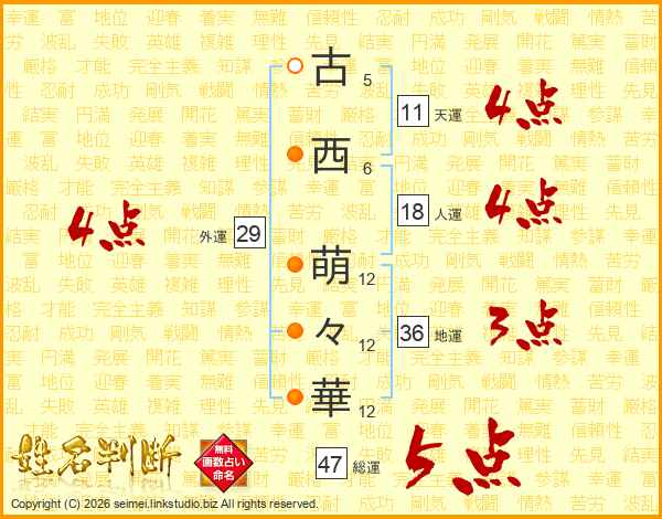 古(5画)西(6画) 萌(12画)々(12画)華(12画)