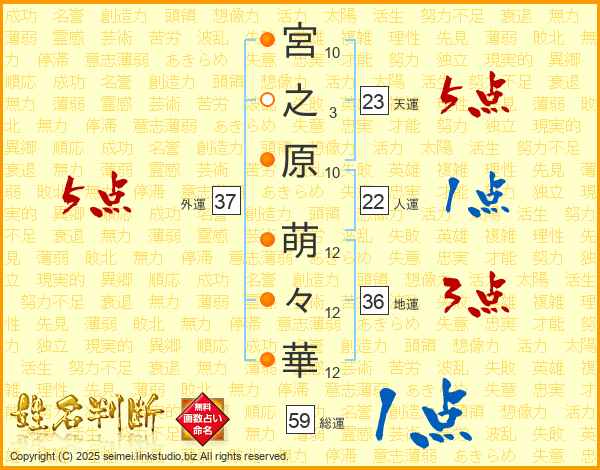 宮(10画)之(3画)原(10画) 萌(12画)々(12画)華(12画)