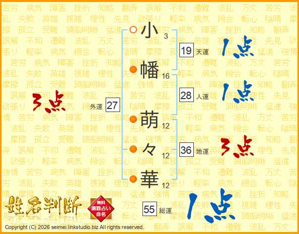 小(3画)幡(16画) 萌(12画)々(12画)華(12画)