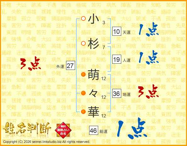 小(3画)杉(7画) 萌(12画)々(12画)華(12画)