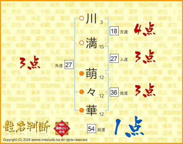 川(3画)満(15画) 萌(12画)々(12画)華(12画)