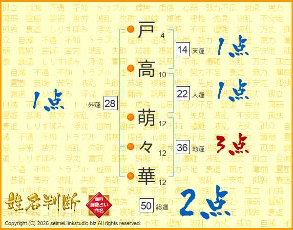 戸(4画)高(10画) 萌(12画)々(12画)華(12画)