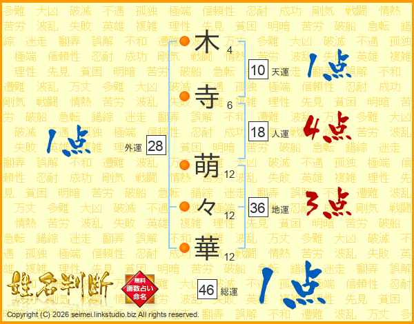 木(4画)寺(6画) 萌(12画)々(12画)華(12画)