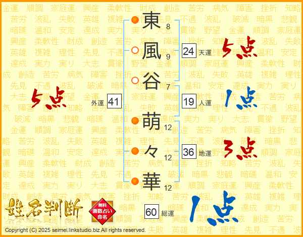 東(8画)風(9画)谷(7画) 萌(12画)々(12画)華(12画)