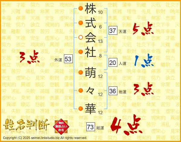 株(10画)式(6画)会(13画)社(8画) 萌(12画)々(12画)華(12画)