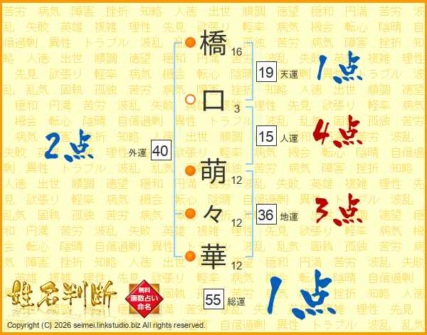 橋(16画)口(3画) 萌(12画)々(12画)華(12画)