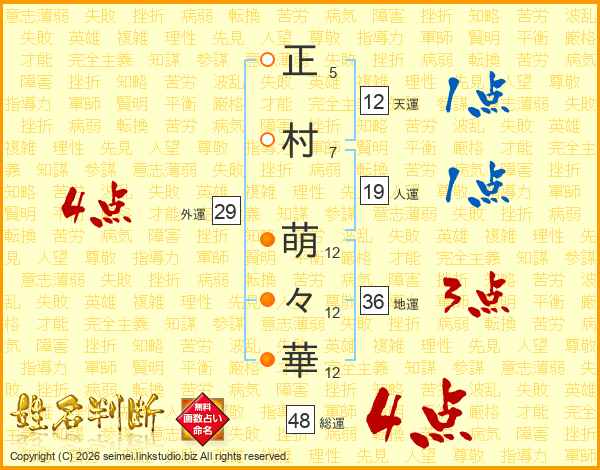 正(5画)村(7画) 萌(12画)々(12画)華(12画)