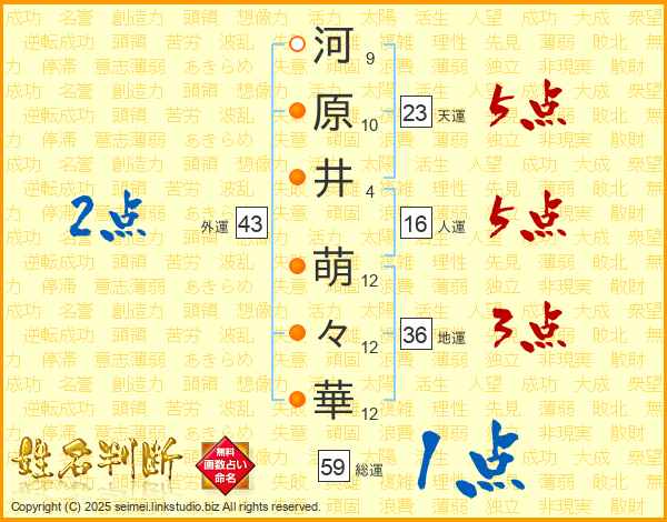 河(9画)原(10画)井(4画) 萌(12画)々(12画)華(12画)