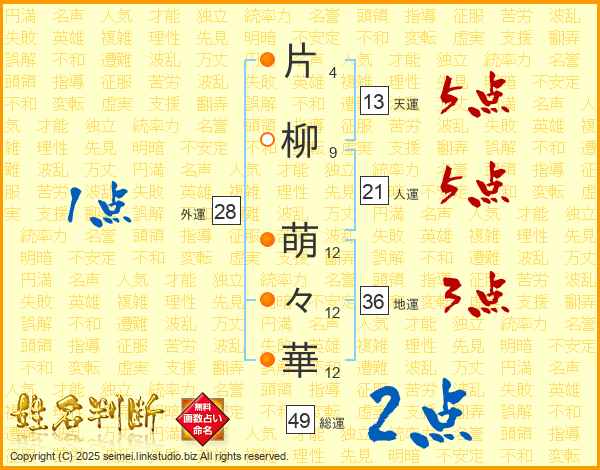 片(4画)柳(9画) 萌(12画)々(12画)華(12画)
