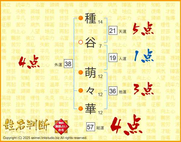 種(14画)谷(7画) 萌(12画)々(12画)華(12画)