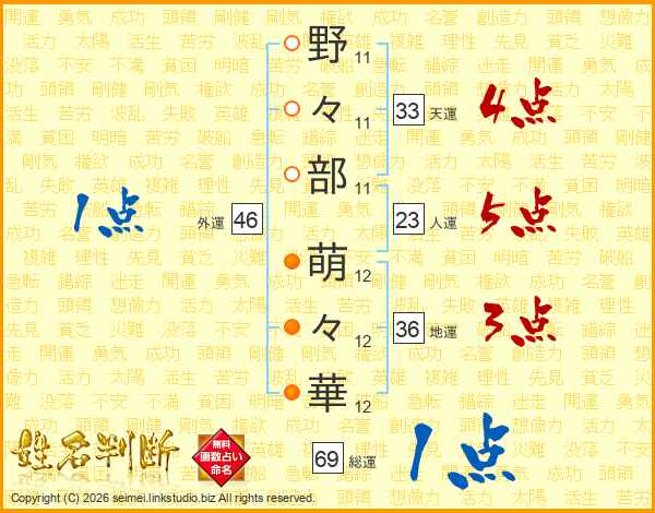 野(11画)々(11画)部(11画) 萌(12画)々(12画)華(12画)