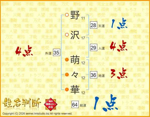 野(11画)沢(17画) 萌(12画)々(12画)華(12画)